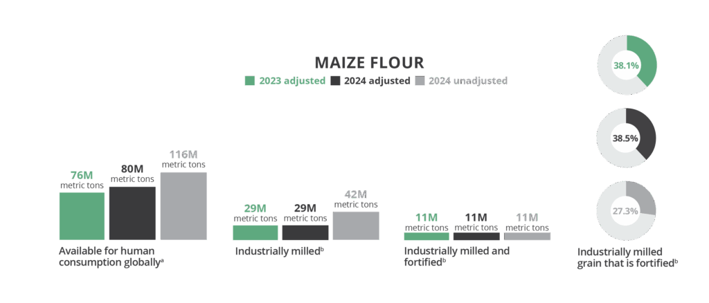 When focusing on countries that FFI considers a good opportunity for maize flour fortification (adjusted), the supply of maize increased in 2024 by 3.9 tons (5%), but only a slight portion of that supply (0.5%) was industrially processed. There was no change in the proportion of fortified maize flour, but when compared to the volume of fortified maize flour in 2023, there was a slight increase of 0.4%.