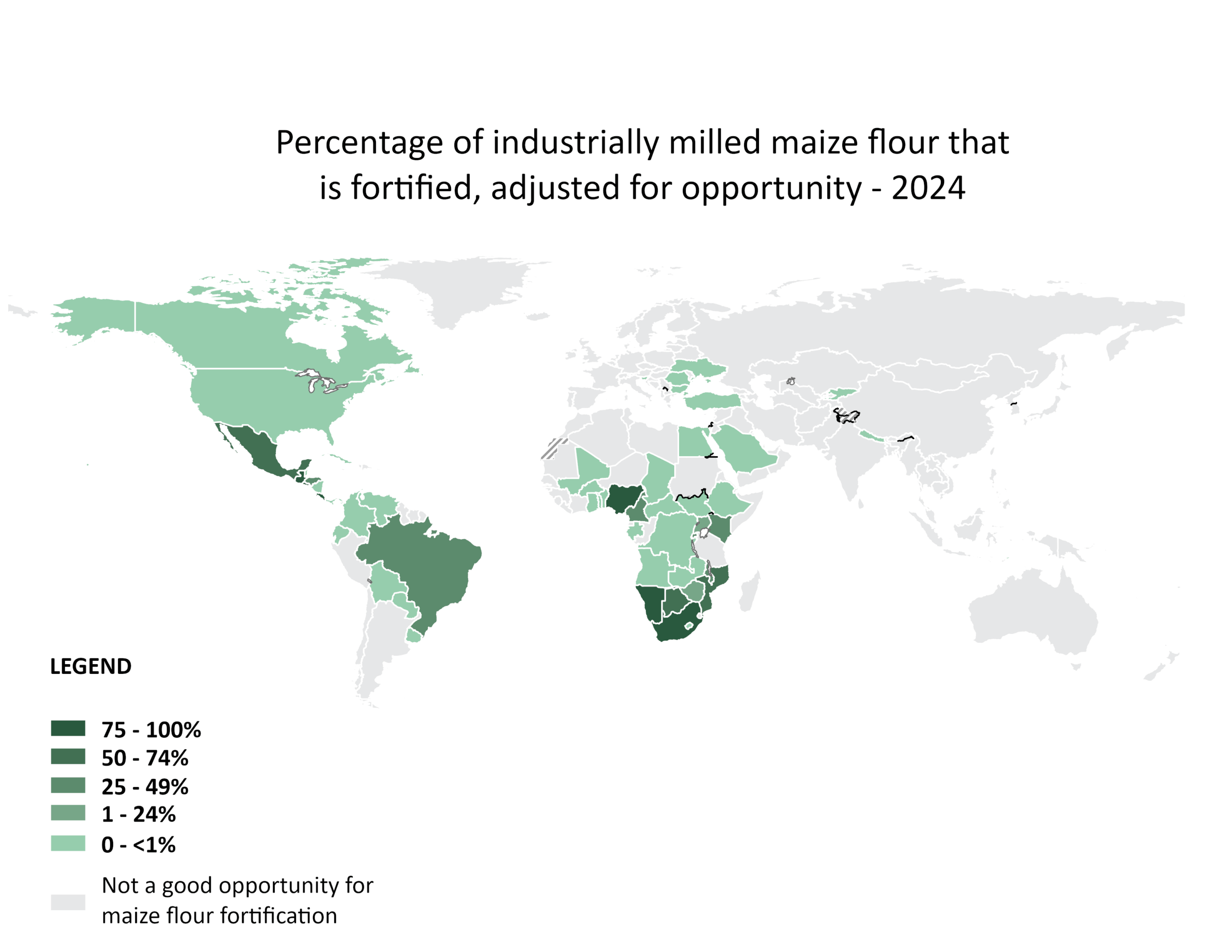 When focusing on countries that FFI considers a good opportunity for maize flour fortification (adjusted), the supply of maize increased in 2024 by 3.9 tons (5%), but only a slight portion of that supply (0.5%) was industrially processed. There was no change in the proportion of fortified maize flour, but when compared to the volume of fortified maize flour in 2023, there was a slight increase of 0.4%.