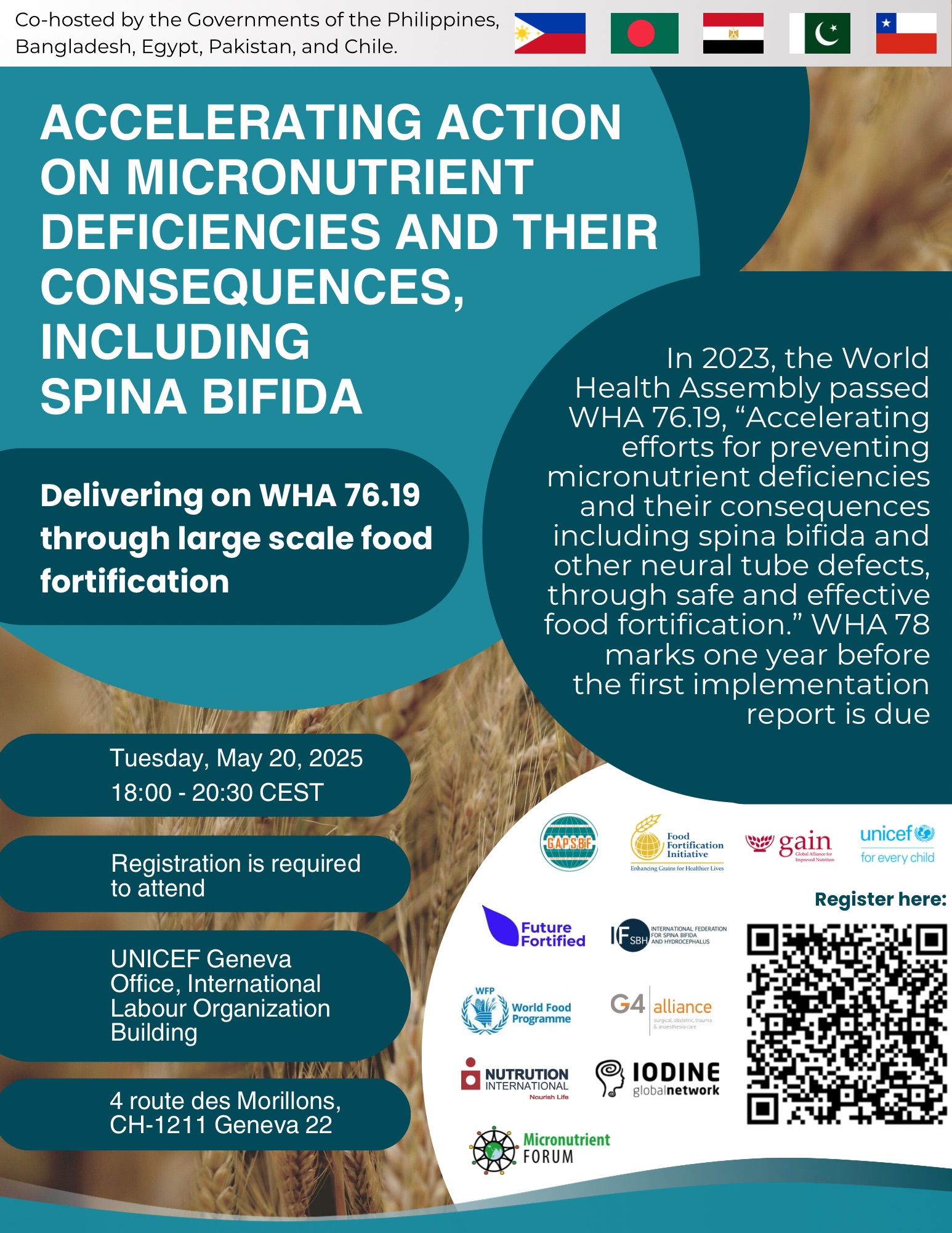 On the occasion of the 78th World Health Assembly (WHA), held in Geneva from May 19 to 27, 2025, the governments of Bangladesh, Chile, Egypt, Pakistan, and the Philippines co-hosted the side event “Accelerating Action on Micronutrient Deficiencies and Their Consequences, Including Spina Bifida: Delivering on WHA 76.19 through Large-Scale Food Fortification”.