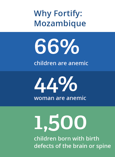 Despite mandatory fortification, Mozambique’s high rates of anemia and birth defects indicate a pressing need for better monitoring and enforcement: 66% of children and 44% of women are anemic, and at least 1,500 children are born each year with birth defects of the brain or spine.